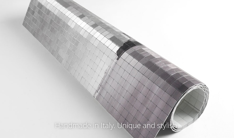 Irial Visual is made of a thin and flexible ‘fabric’ of aluminum tiles that takes on reflections and different shades depending on the viewing angle and exposure to sunlight. The random manual arrangement of the tiles means that each fabric is unique.