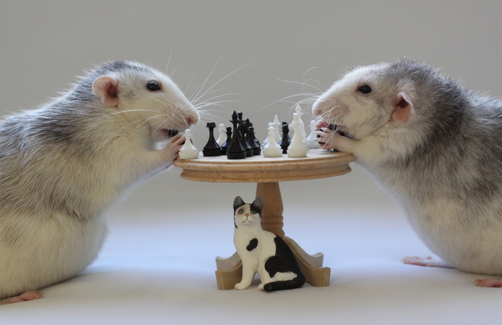 When the setting was completed, I took the rats and let them free on each side of the table. They went to the chess pieces at the same time. But within a few seconds the table and chess pieces tumbled down and the whole setting was completely mixed up. I had to be very fast! This happened several times, so I had to start over again and again. I cannot remember how often I had to rearrange the complete set up to have at least one good photo.