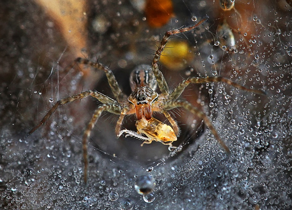 I had the idea of the photo on a morning walk when I saw lots of spider webs in grass filled with dew droplets sparkling in the sunny morning. The next day, I woke up before sunrise, in order to get a good light and to look for a position to shoot the morning dew and the cobwebs. After getting the best position, I tried to take some pictures carefully to make the spider used to my presence. Next I waited for the sun to illuminate the cobwebs. Luckily the spider then went out of the nest to get food. I had the opportunity several times to get the best pose of spiders before he went back. It took some patience, because everytime I moved the spider went back and didn't come out for some time.