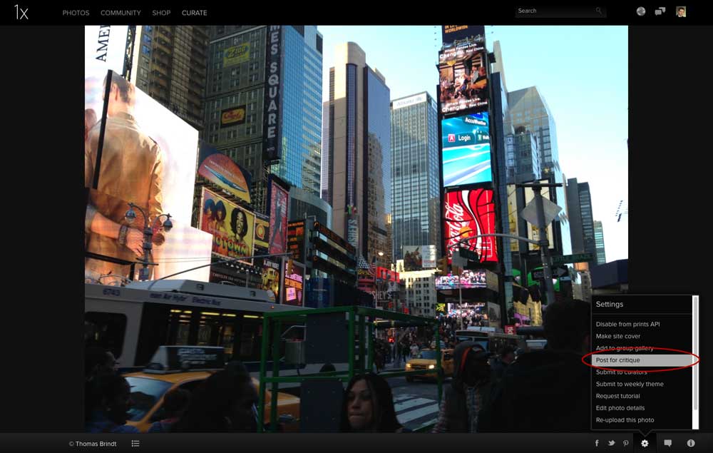 To submit a photo to the critique forum. Simply enter the cog wheel menu on the photo and select "post for critique".