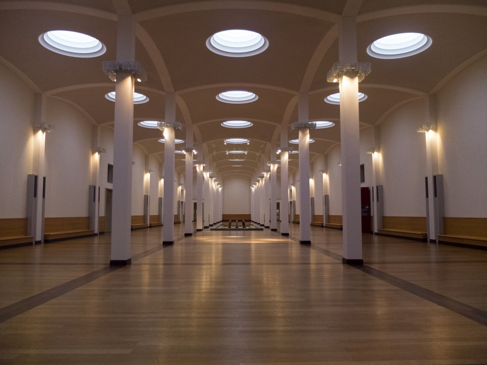 The spacious hall is conceived as a place of quiet reflection, which is very well caught here in this photograph by Dick Heckmann. It appears like entering a temple. The atmosphere is serene - as if never disturbed by visitors - but also a bit serious. Dick emphasizes this by concentrating on the strict symmetry of the hall and its repetition of forms, which is only broken by the more playful lamps in the ceiling and the arches. If he had chosen another point of view, the impression would have been quite different.