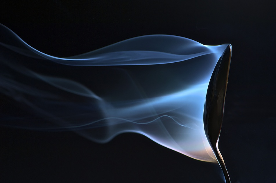 So with this concept in mind I started creating the picture using only these two elements. The spoon obviously presented no problems, but the smoke needed to be thick enough to achieve enough prominence in the image that it balanced the spoon. After trying different sources to produce the smoke, I opted to use incense sticks since they generated a very dense smoke with a bluish tint.Once I had decided which items I wanted to use, I started to organize the scene.