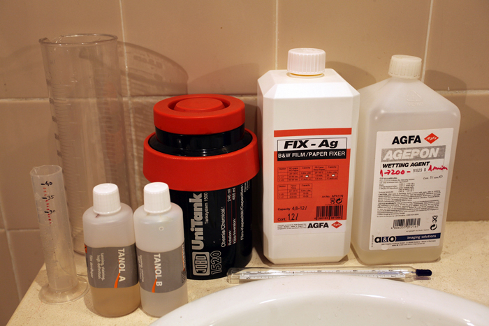 I include here one more step in form of the wetting agent, from Agfa in my case, it comes ready to use directly out of the bottle; after washing time, just fill in distilled water and add a few drops of wetting agent, agitate a little and leave it there untouched for 1 min, then pour it off.