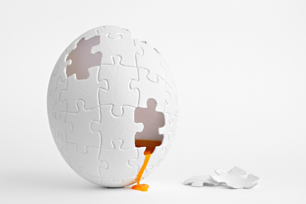 For me, it was very important to follow the white theme of the other photos in the series and also to include the orange color of the yolk as a secondary detail. My kids often play with all kinds of puzzles, and that's how I made the connection between a puzzle and an egg. Once the idea was in my head, I needed to collect the raw materials. For this specific image in the series I decided to use an ostrich egg since its shell is much harder than a chicken egg, which would allow me to carve it easier without breaking it. I got the egg from a friend who had already emptied it by making a hole and draining it.