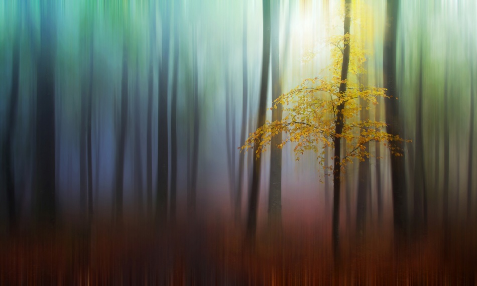 The resulting image comes from one single shot in the forest. The initial photo is a straight shot (without camera movement) that I cropped a little to create a slightly panoramic effect, which helped draw attention to the subject. I didn't have my tripod with me the day I took this photo, and I soon realized that was a mistake: I continued to move deeper into the woods, and the mist and low light forced me to keep increasing my ISO setting. If I had had my tripod I might have used an aperture of f/16 and ISO 100 since there was no wind. There wasn't any special setup for this photo, it just happened. Walking through the forest, I found the yellow tree standing out in high contrast to everything surrounding it.