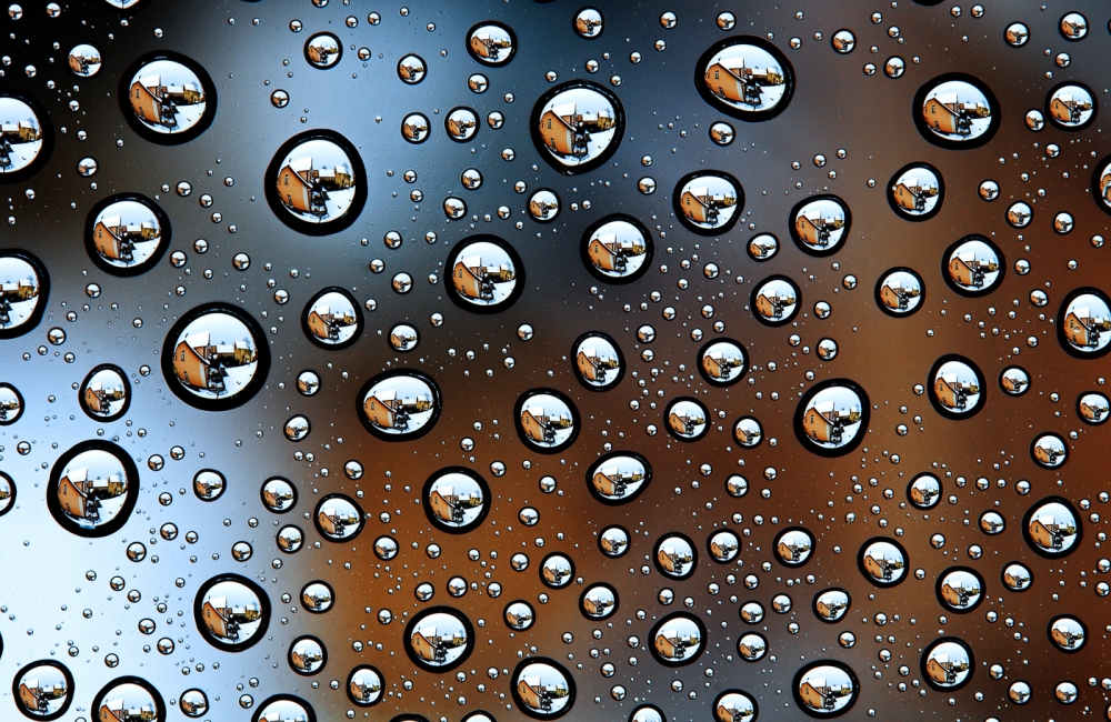 I took some photos in RAW format with different qualities of natural light. First I used subdued light and an overcast sky. Then I tried backlighting as the sun broke through the clouds, but found the sun reflecting in the rims of the drops rather annoying. I finally selected an image taken in cloudy light. In my opinion, a balanced distribution of varying droplet sizes produced the best effect.