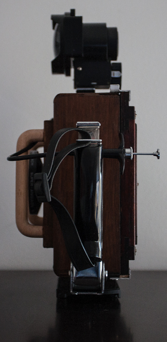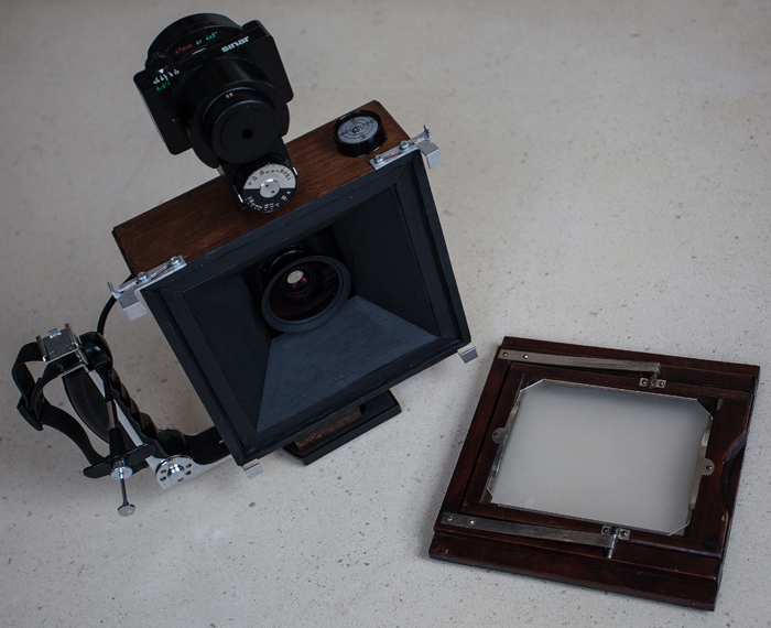 As can be seen, both viewing systems are redundant. Only the top viewer is enough, and it's what I use most of the time, as there is no need to use the ground glass for focusing. The film holder back could have been replaced for a simple holding device. Still it's always wonderful to view the framed image on a ground glass.