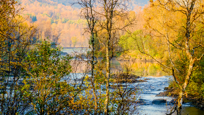 Next morning it felt good being in bed. My body underneath the quilt was comfortably warm but my nose was freezing. I had a look at the thermometer: 6º in bed and 2º outside….. I peeked through the window: fog.  Wow! Time to get out, big chance for good images.  It was 6h30 and only 15 minutes left for the first sun rays veiled by the fog, adding mystery to the forest.  But it fades fast and when I arrived at the river, the canopies of the trees were lighting up and greeting me with a show of yellows oranges and golden reds. There was music, it’s the water running in between the rocks.  The trail was like a carpet of autumn coloured leaves sneaking between the thick moss cover, red berries and  mushrooms of all shapes.  If I had turned the corner and suddenly was facing a gnome,  it would have been the most natural thing happening this place 😊