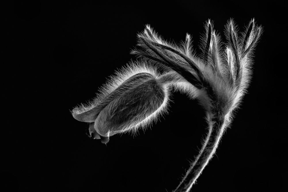 These magnificent flowers only appear in March. When the winter is over and the first warm days arrive, they bloom for one or two weeks only. On the last day of March 2008, I went out for a photo shoot one hour before sunset. I took my camera, macro lens, tripod and a black T-shirt. It was a quiet walk in the diffused twilight. My goal was not to capture the usual macro shot with a long depth of field: I wanted an artistic rendition. I wanted to emphasize the shape of the flower, and especially the fluffy white hairs. Therefore, I did not use flash and the depth of field was just enough to keep the silhouette sharp while the rest of the flower remained slightly out of focus.