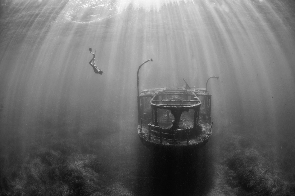 Deeper I fell and the density of life faded with the sunlight. Then, out of the increasing darkness came a surreal sight. A row of huge rubber truck tyres appeared, each one tethered by a rope from a sunken wreck below, straining towards the surface like the dead fingers of the drowned. The ropes that held them leading down to the depths were an  enticing invitation to explore that was impossible to resist.
