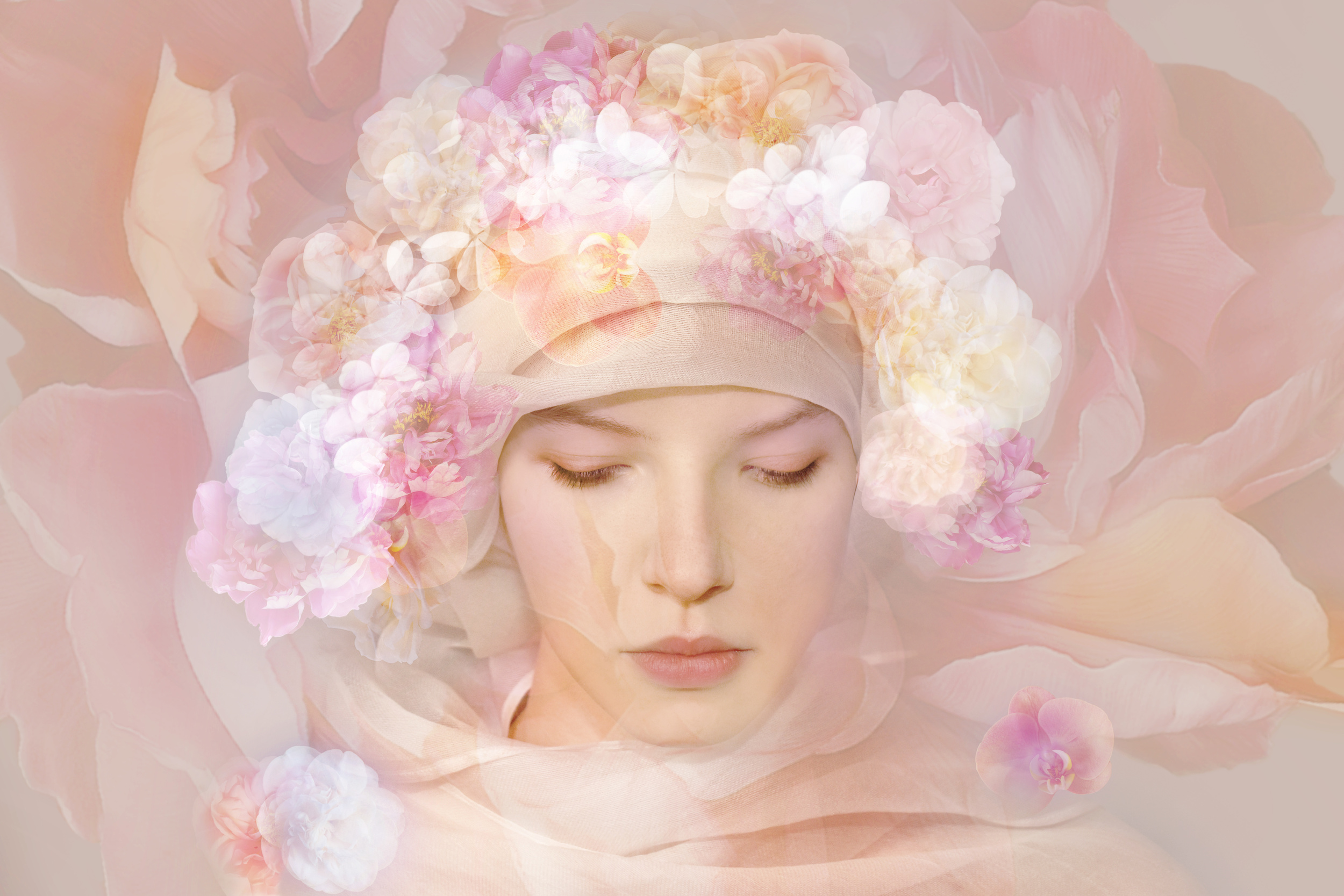 Flowers, plants contain the whole mystery of life cycles, of beauty and decay, light and darkness. They speak to us about interconnectedness and separation, boundaries and infinite spaces, birth and return to silence. My “florals” are musings about the persistence of beauty in ageing and decay, about the traces of the everlasting in the ephemeral. The feminine and the realm of flowers have always been related in the visual arts. The portraits I create are at the same time floral compositions, suffused in a sea of light that comes from every angle and from the subject herself. They are about a young woman who watches the world and her quest for an integrating principle of the spiritual into the mundane. She represents the idealism of youth. The model in these photos is my daughter.