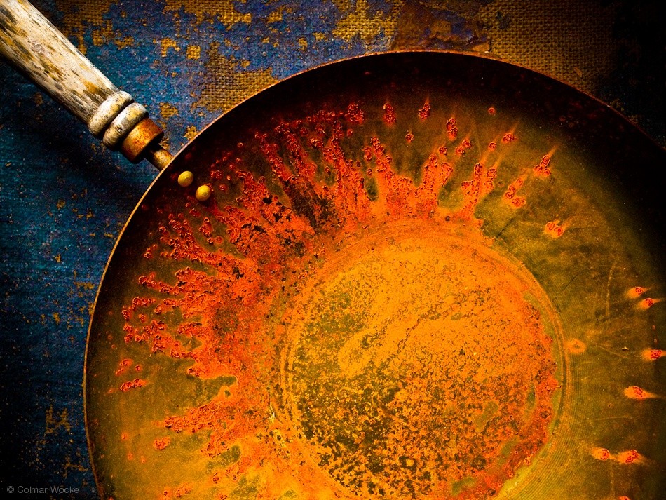 Colmar, who is a South African living in Switzerland, describes his work well. Just an old rusted wok pan, but the vivid colour of the rust leads his imagination to feel as if the fire is inside the pan, leading to a visual metaphore in the flame-like rust. The importance of an authors description of his work and what it means, is always important. (and something I often fail to do myself)