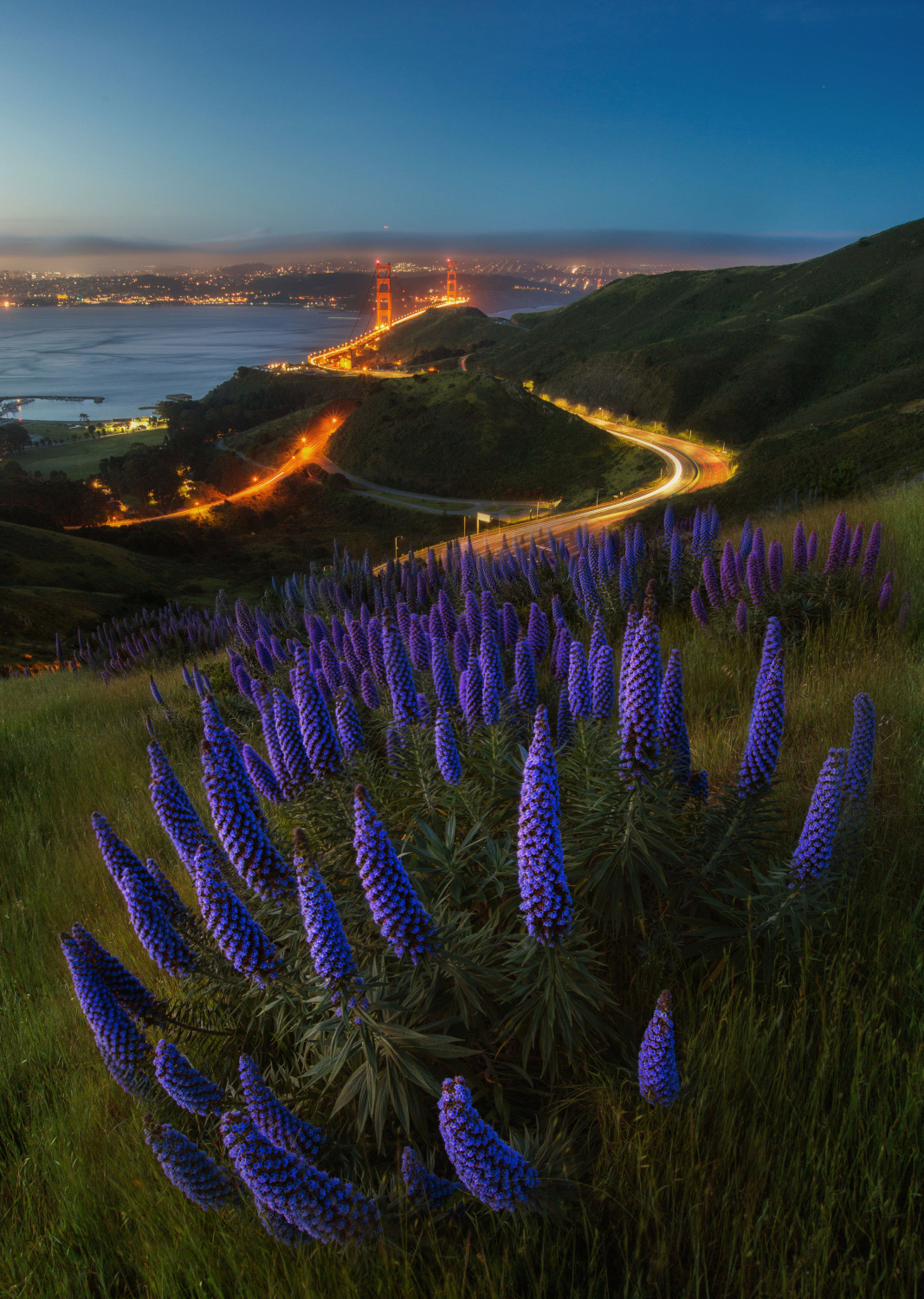 Echium Fastuosum Candicans widely grow in the San Francisco Golden Gate area. This particular cluster grew on deep slopes. Its location is perfectly aligned with a circle of traffic toward the Golden Gate Bridge. When I first found them, the plants were still tiny. I had to visit them 10 times until they grew up and were also circular. To reach this area, I had to drive one hour and hike another hour. Because I needed to be on the spot before the blue hour in the morning, I had to leave home two and half hours before sunrise. The time spent and hard work paid off. I got the composition I wanted. If I shoot one more photo of this spot, I will wait for and capture fog or dreamy clouds to enhance the mood.
