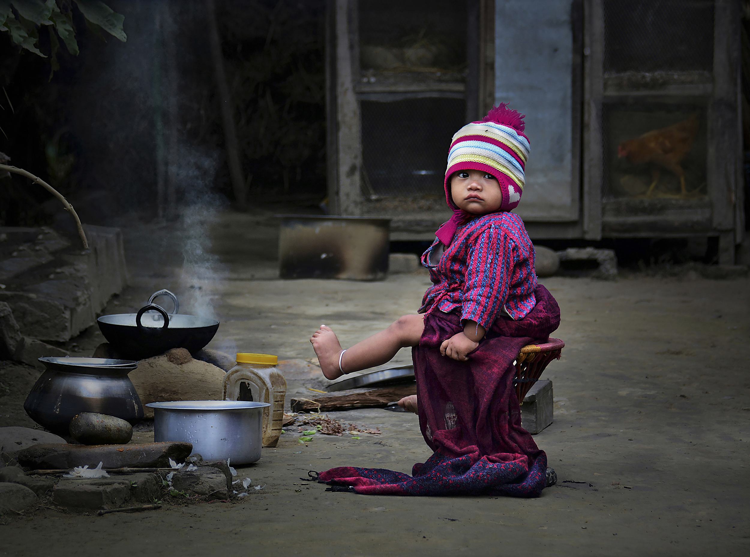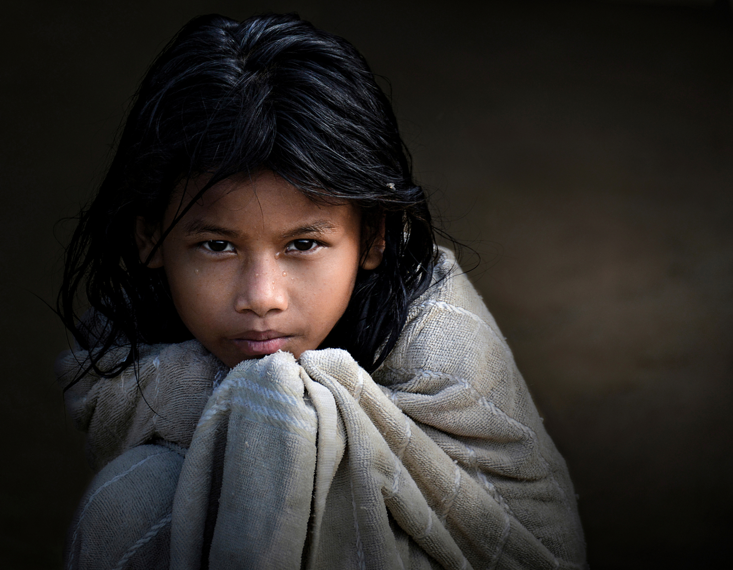 In this small village hidden in the jungle, a little child dries herself after she took a bath in a tub.
