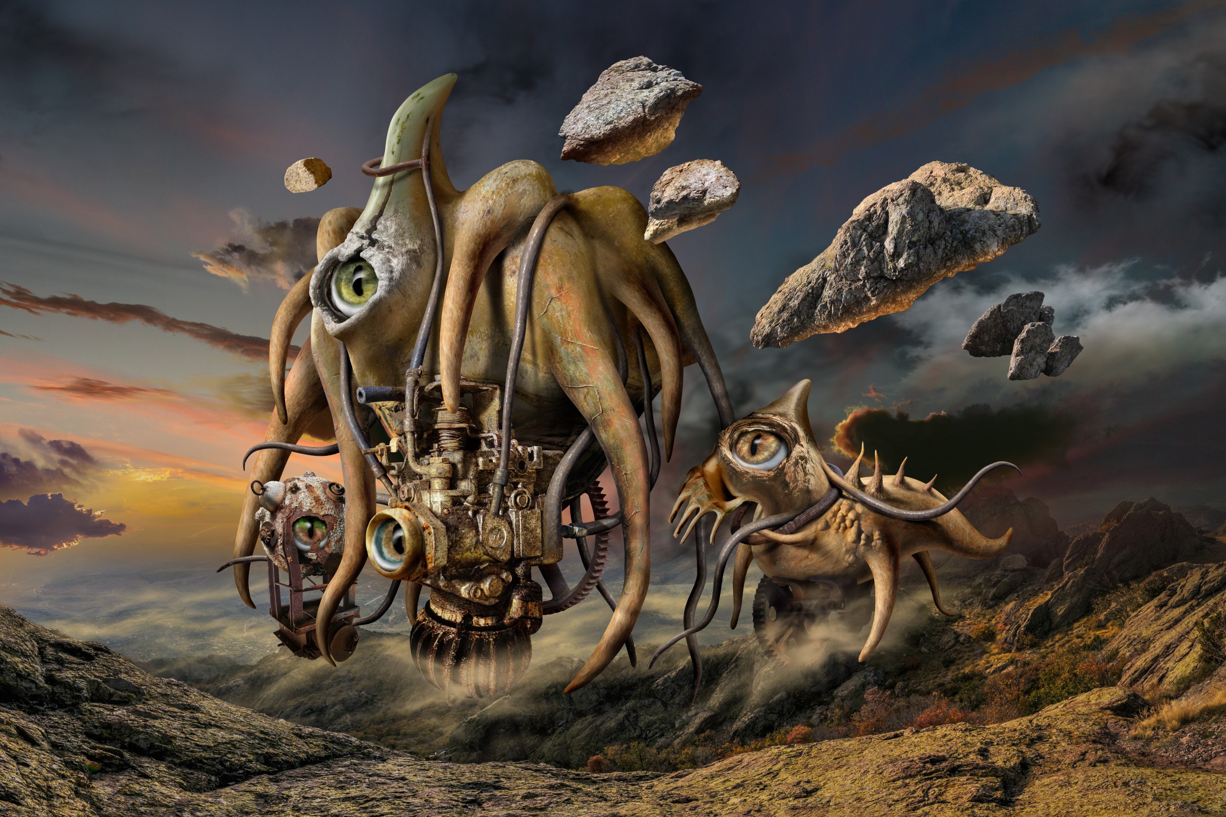 Sometimes I wish the workflow was shorter, but usually that doesn't happen. I have managed to finish 2 works within a month, but others take a year. It depends on inspiration, desire and incentive to work. When I have enough cut out photo details ready I start combining them together to create the main object. Then if I'm happy with the result I start making the auxiliary objects or creatures. This shapes the composition and the interaction between them. Finally comes the turn of the background or environment, light, shadow, etc. I use parts of many photos to get a strange and fantastic world.