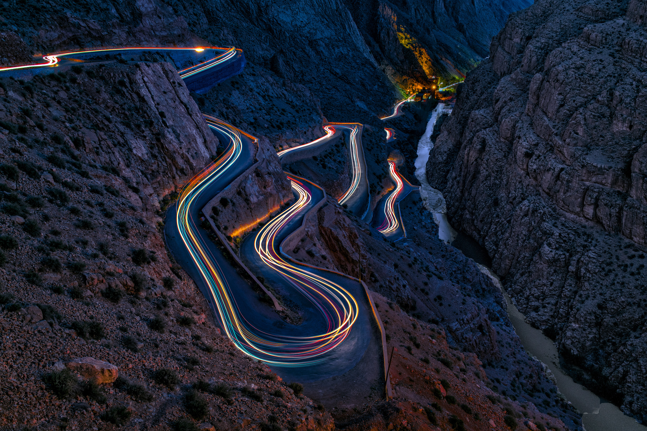 My favourite photo is a therefore a light painting and landscape picture, taken in the Dadès Gorges in Morocco. I was there with some friends and we wanted to shoot the spectacular serpentine road at blue hour time. The aim was to catch the traces of light from the headlights of the cars. But it is a lonely area and we found there was no traffic at all on the road. So we had to send our two SUV s twice down the street and up again. The result was a picture with 20 minutes of exposure time!