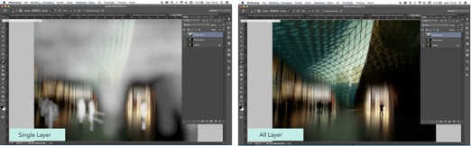 2) I made a copy of the Motion Blur layer, and using the Eraser tool with a soft brush and Opacity set to 8-10%, I gradually erased the specific areas that I wanted to be sharper in the image. By clicking on the eye beside the underlying layers in the Layers Panel, I was able to see exactly what I was erasing. The screenshot on the left shows what I erased with the other two layers turned off. The screenshot on the right shows two of the three layers turned on (the top and bottom layers) and what the Eraser tool revealed in the underlying original background layer.