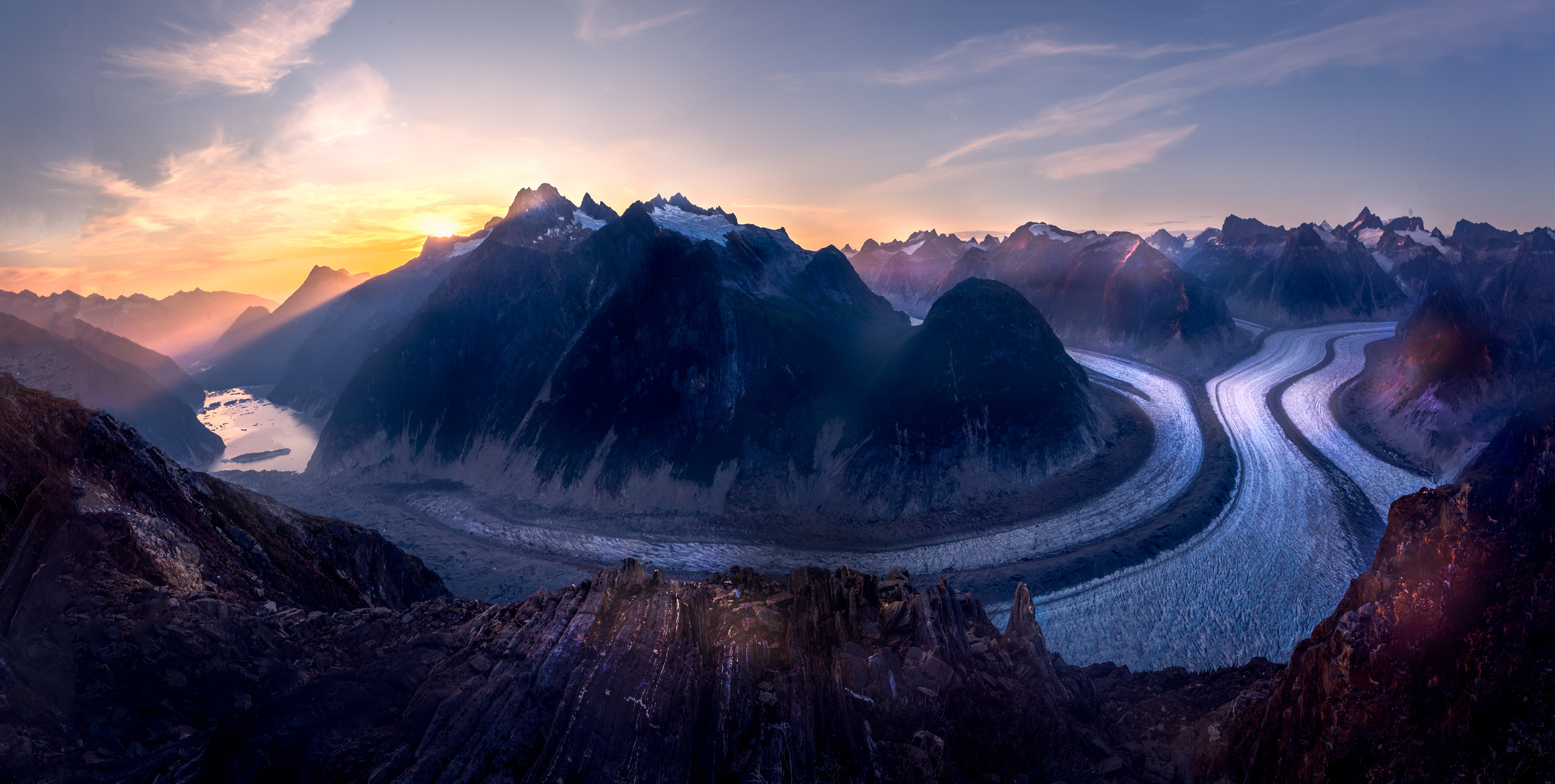 My first landscape photography tour started in Alaska with Marc Adamus in August 2019. It started in Juneau, the capital of the state of Alaska, with two helicopters dropping us into the mountains with all our camping equipment. We camped at the first site for two days. Then helicopters came to pick us up and drop us off at the different sites. But after the helicopter left, Marc realised that we were far away from where we were supposed to camp. So we had to carry all our luggage and tents a long way up the mountain on rocky terrain, because there is no road. And probably no one had ever been there before. After more than an hour's struggle, we finally reached our campsite. The weather looked perfect for the day and everyone was happy after a delicious dinner cooked by Marc. Marc is an excellent cook. He has cooked us different meals every day. All are delicious. However, the next day, early in the morning around 2am, the heavy rain started with strong winds. All the tents were blown away except for one. I had to move to another place to put up my tent. We walked to the ice cave and explored inside and out. A few days later we went to Petersburg. There we took a small helicopter operated by father and son to take photos. We saw beautiful Alaskan scenery from the helicopter and on the mountain.