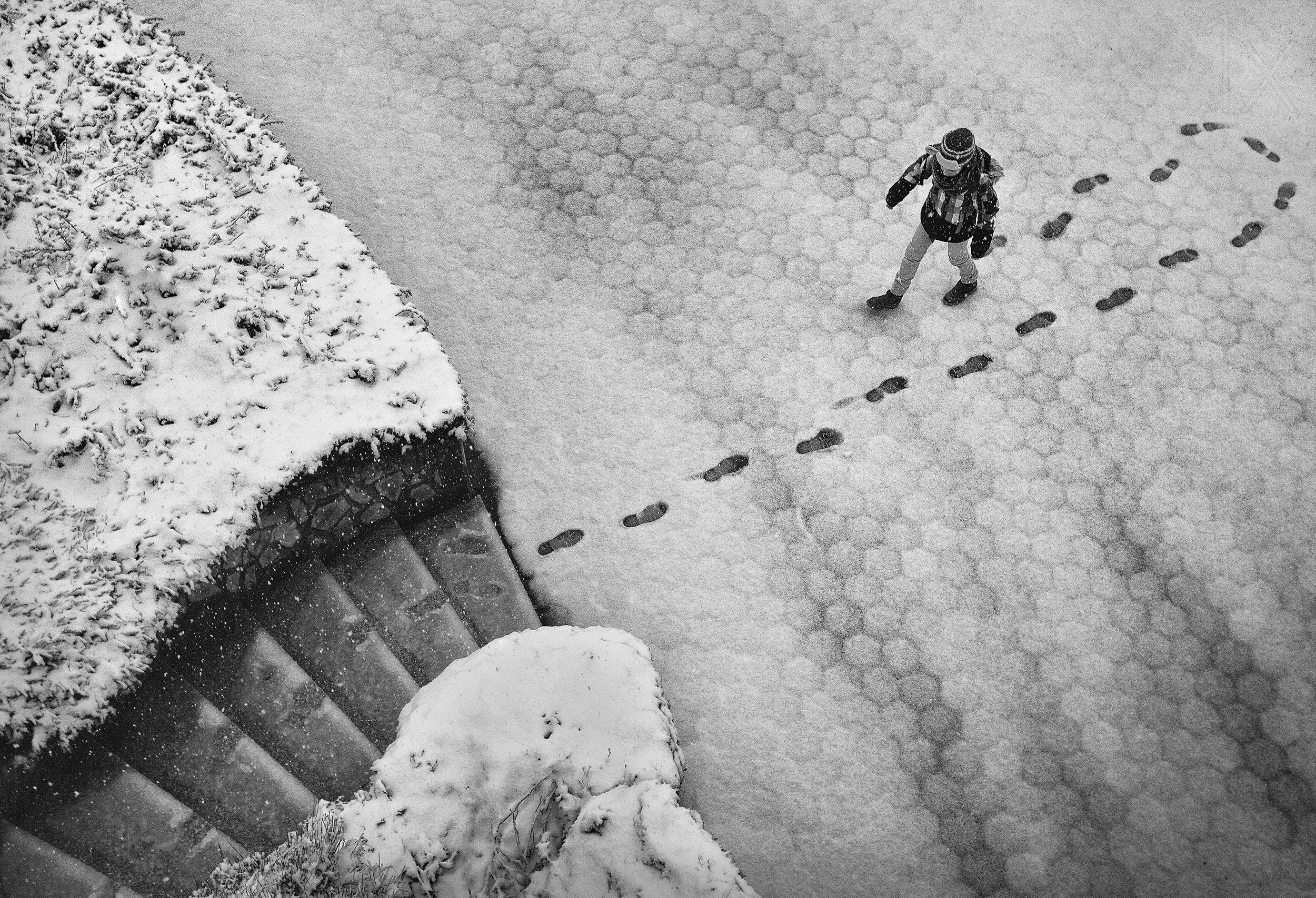 "I was also lucky because the white snow lightened the otherwise dark stairs, but the textures, patterns and details beneath the snow were still visible."